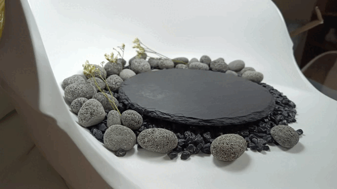 Matériaux : Pierres de rivière, plantes d'intérieur, éclairage doux, motifs organiques.
